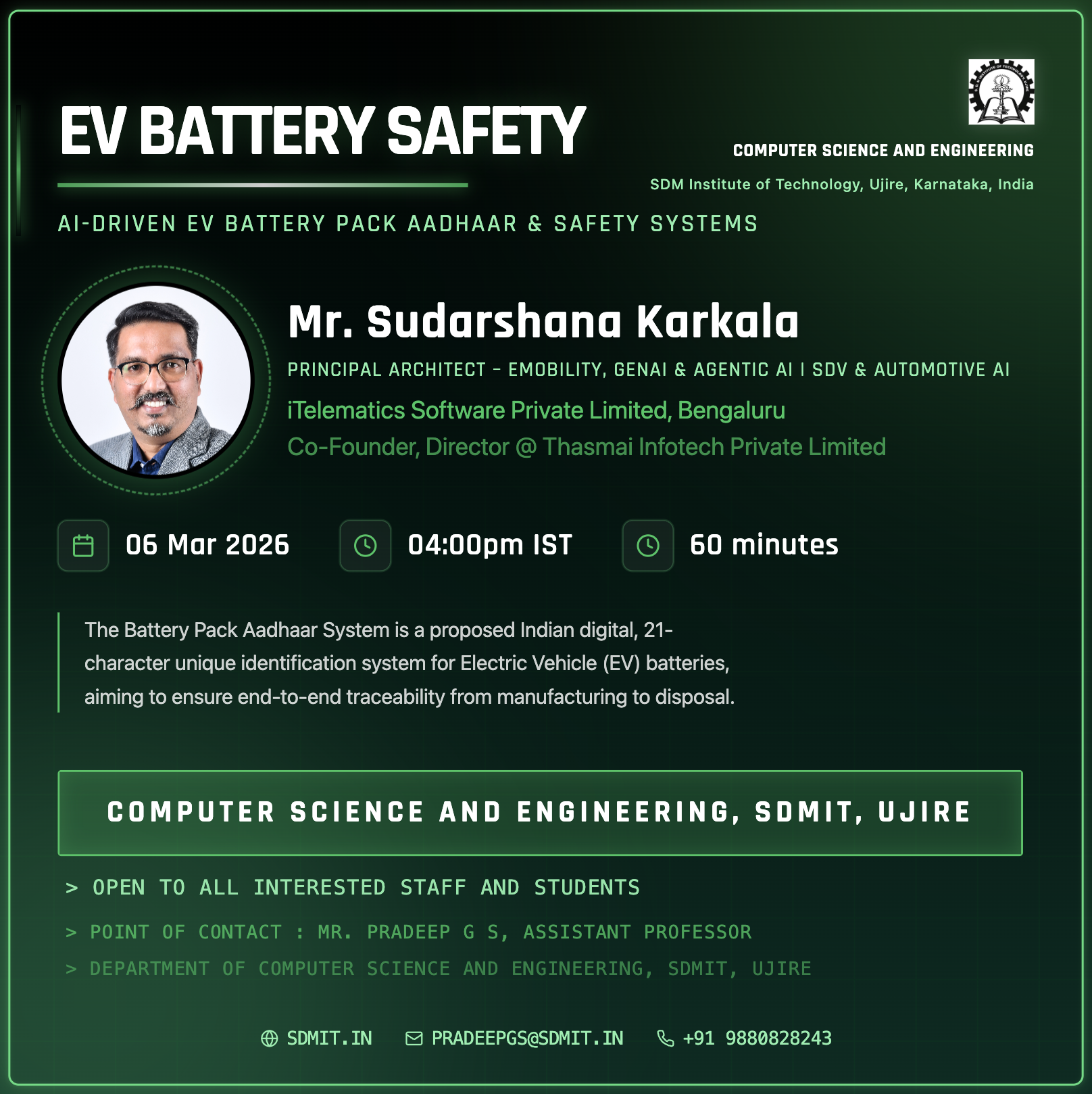 EV Battery Pack Aadhaar System AI-Driven EV Battery Pack Aadhaar & Safety Systems Computer Science and Engineering, SDMIT, Ujire | Required | Submitted | 2026-03-03 | View |