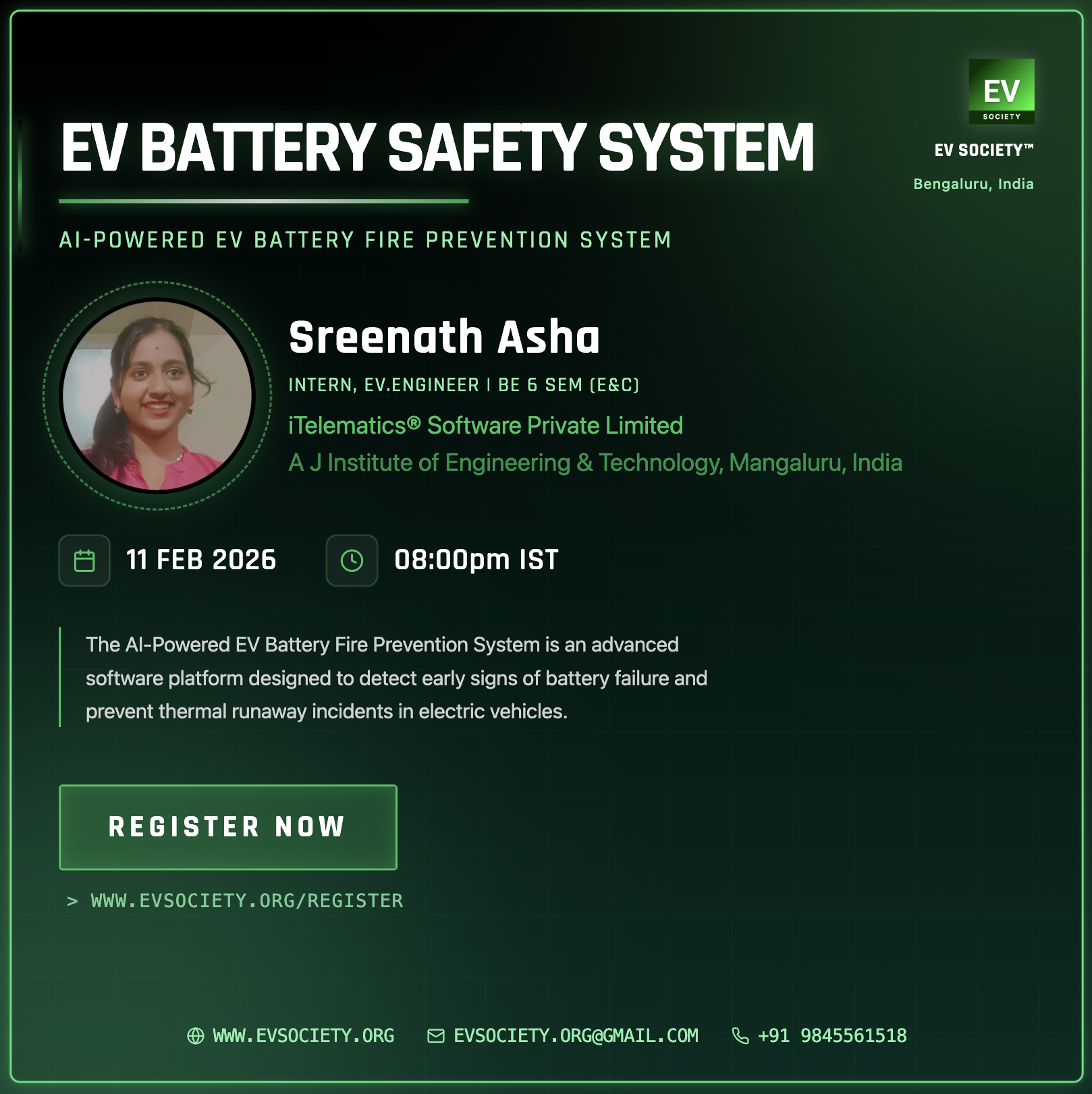 WEBINAR - EV BATTERY SAFETY SYSTEM (LinkedIn Event) AI-Powered EV Battery Fire Prevention System | Required | Completed | 2026-02-11 | View |